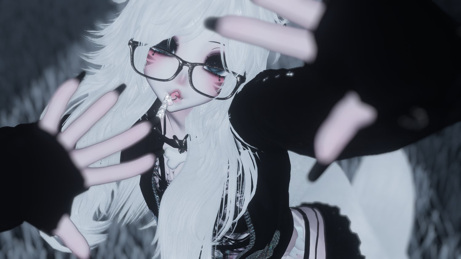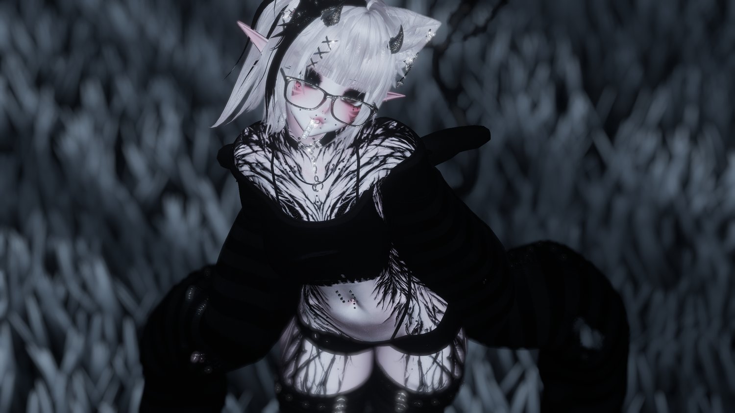 body piercings - arm warmers, waist belt, and necklaces - chained glasses - horns and hair clips - hentai mouth hair clip